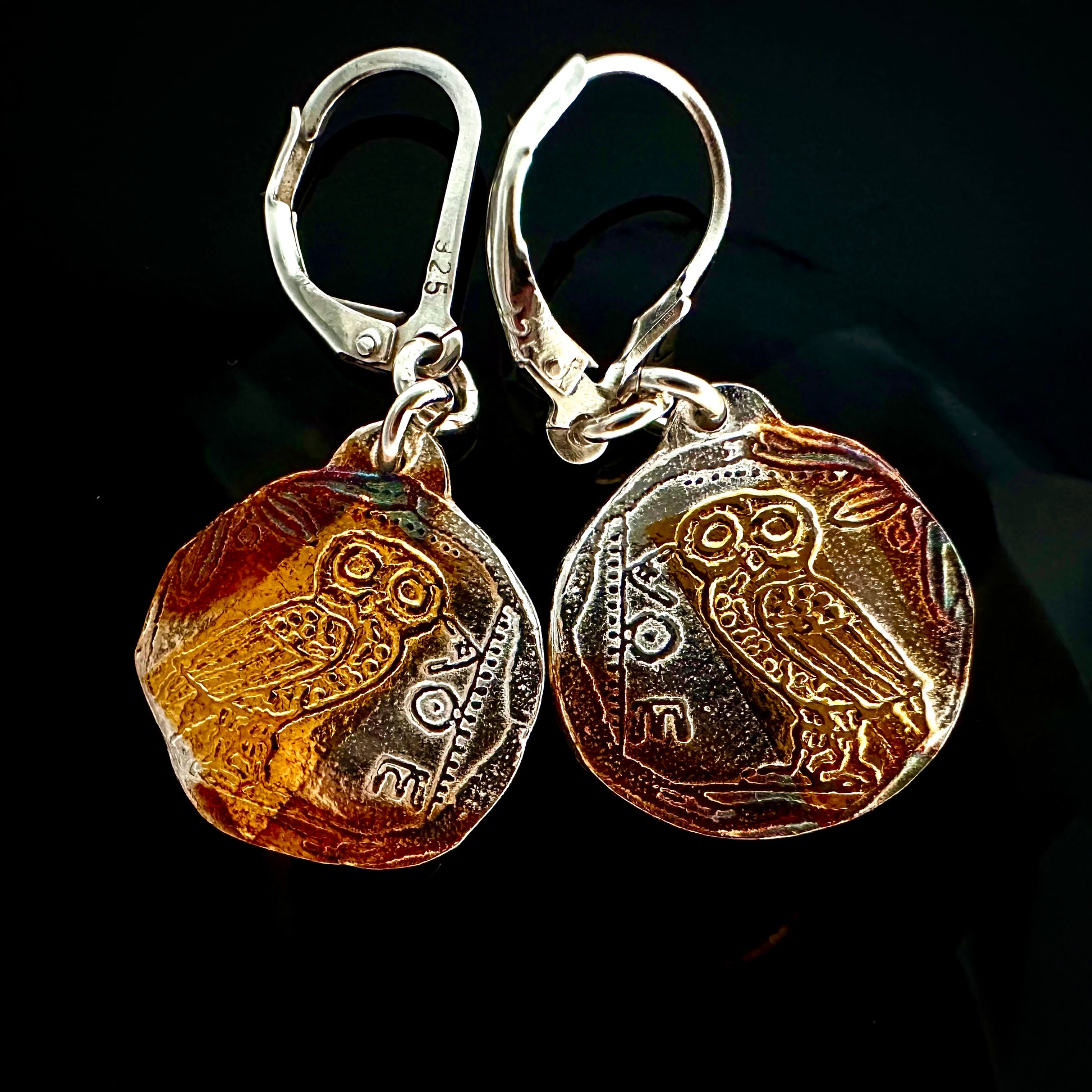 I pressed the owl coin stamp into silver clay to get the impression. After refining, the dried clay was kiln fired for 2 hours at 1650K. What came out was pure 999 silver. The "coins" were burnished with 24K Gold foil, an ancient Korean technique called Keum Boo. I painted on patina on the edges of the coins.