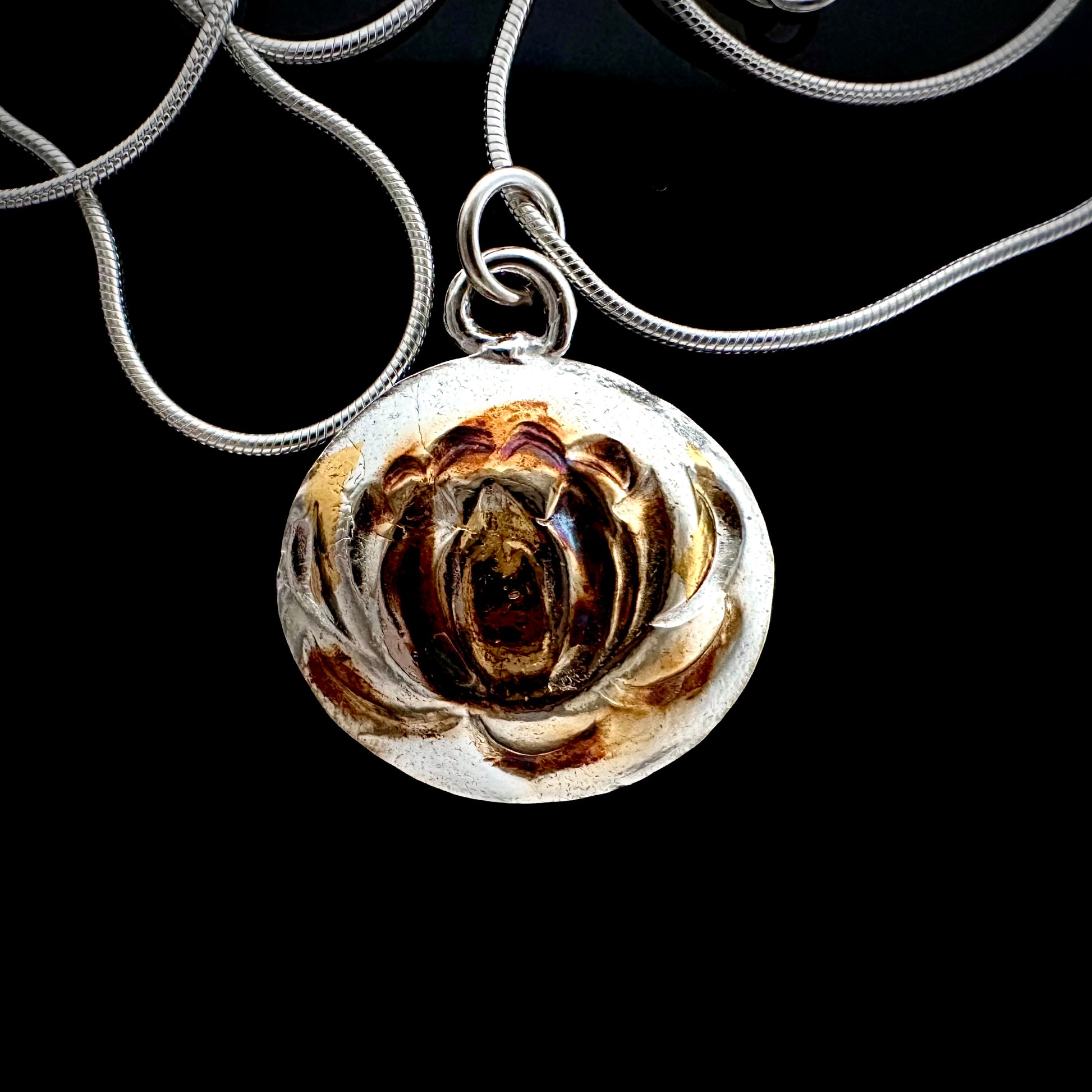 I found a small metal lotus in an old jewelry box while looking for something else. I cleaned it up and decided to use it as a template to make a silver clay lotus, which I put on a curved surface to dry. The final appearance was that of a blooming lotus which I made into a pendant.
