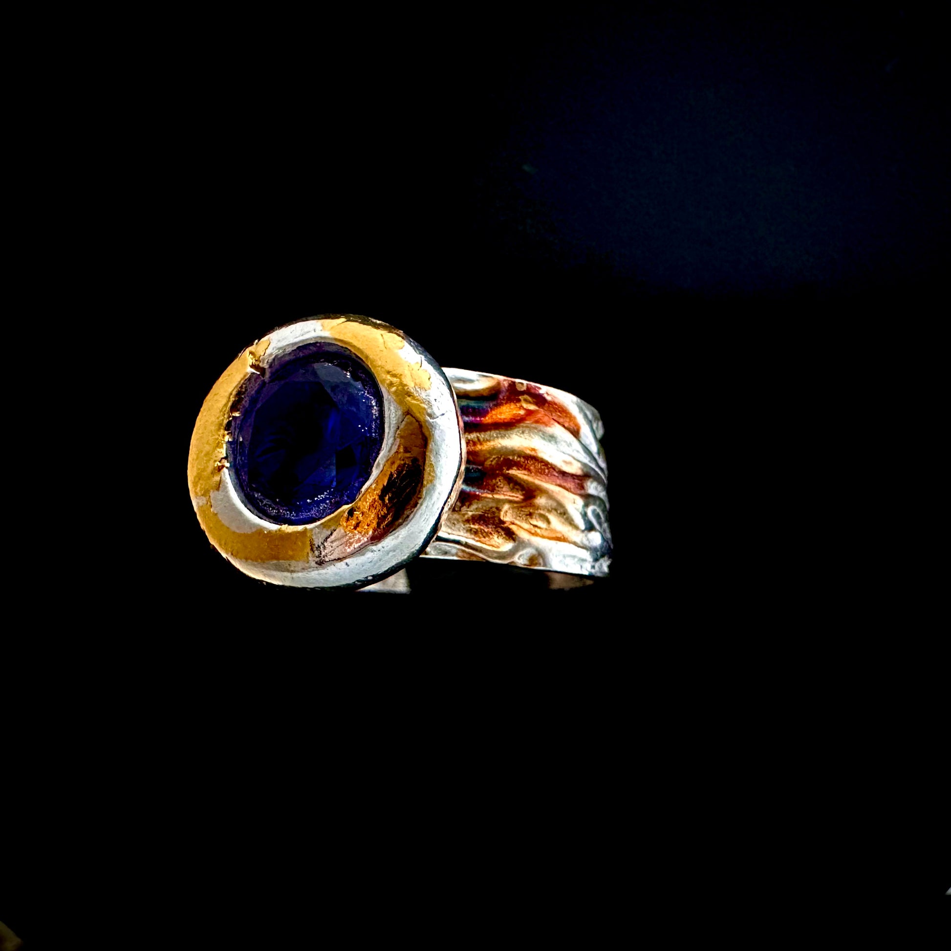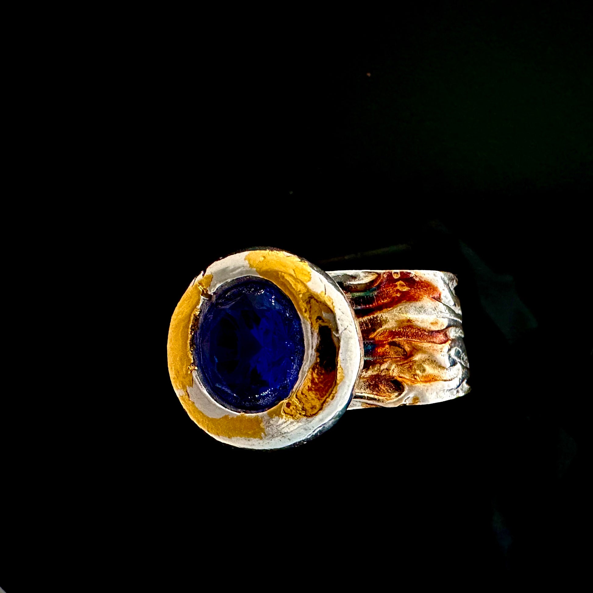I burnished 24K Gold foil onto the pure silver girdle or collar of the stone as well as the part of the ring shank at either side of the stone. This is an ancient Korean technique called Keum Boo. The gold surrounding the brilliant blue of the stone is stunning.
