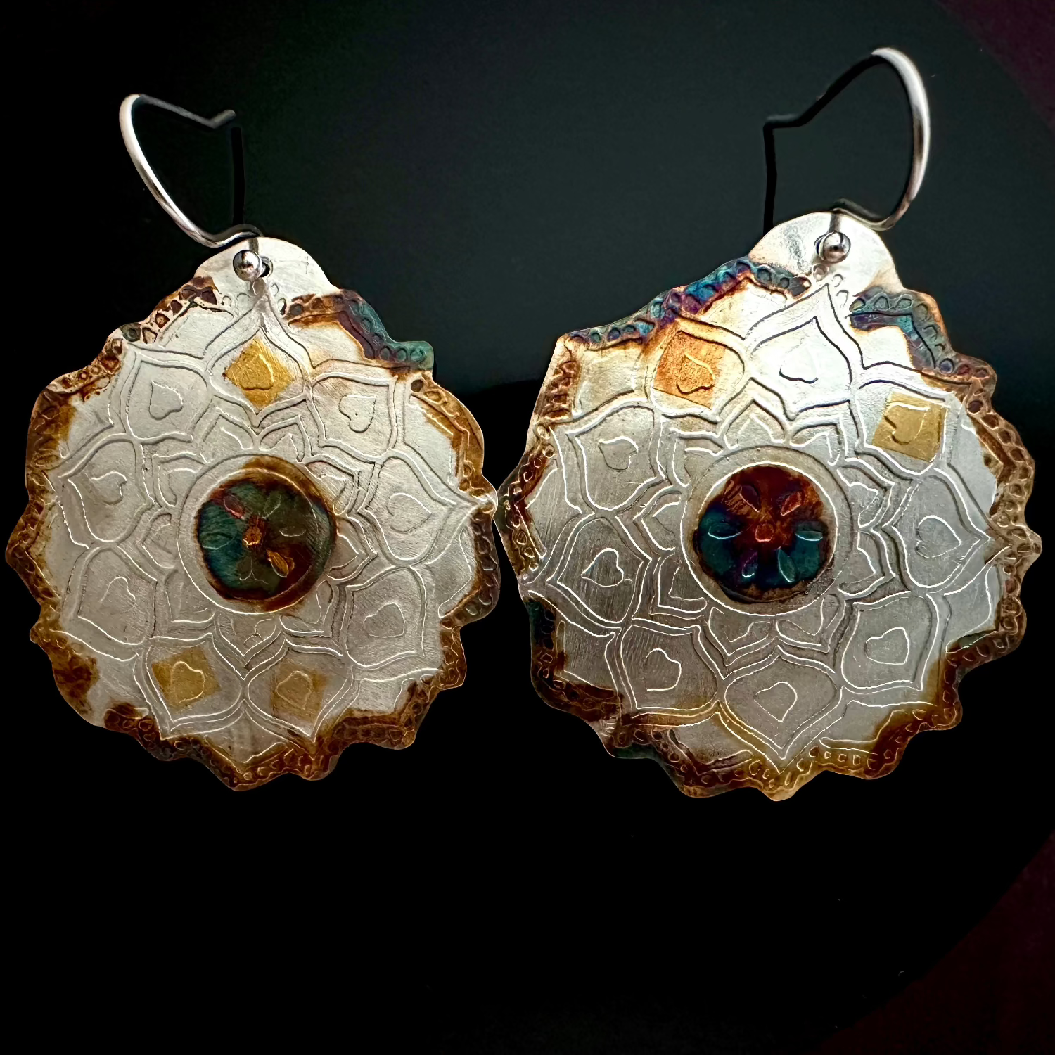 I cut out the earrings from the silver sheet using a jewelers saw. I filed and smoothed the edges. I depletion gilded the silver and then burnished 24K Gold foil onto portions of it. This is an ancient Korean technique called KeumBoo. I then painted patina onto the etched surface to accentuate the design and make it pop. The lovely blues and copper colors look stunning with the silver and gold.