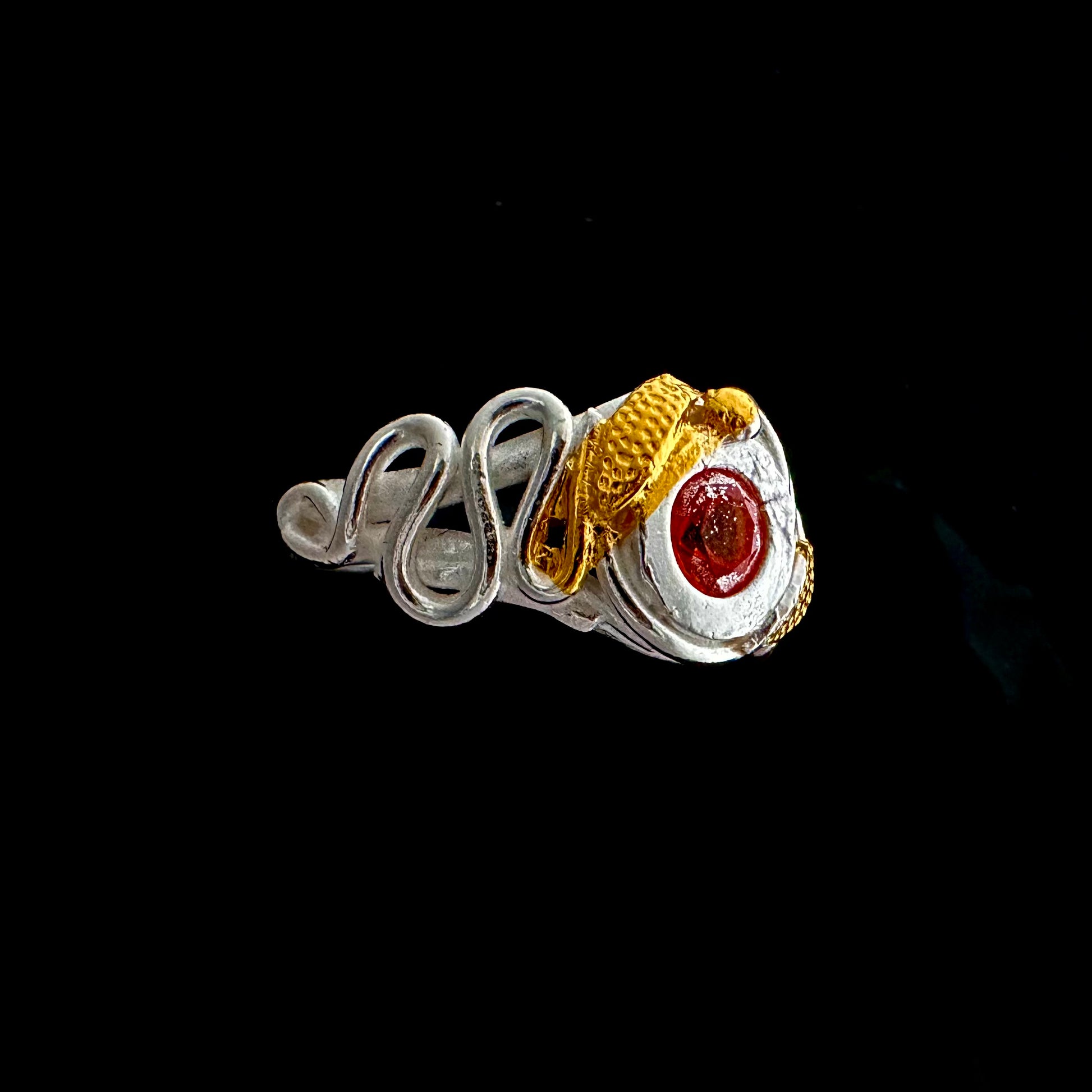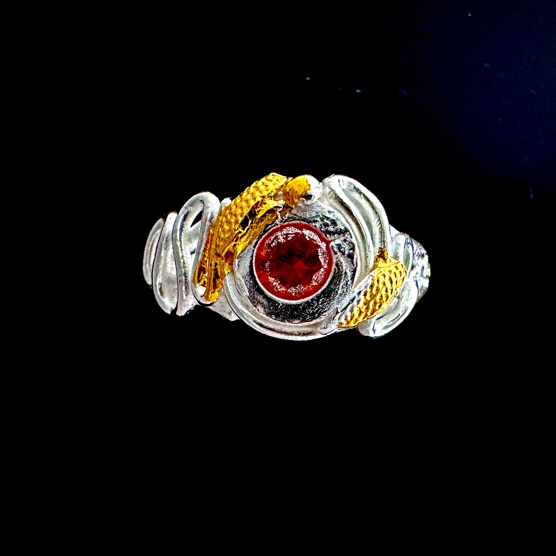 After refining, the ring was kiln fired for 2 hours at 1650F. I burnished 24K Gold foil on the leaves surrounding the Citrine to make the colors pop! The technique of adding gold is called Keum boo an ancient Korean technique.