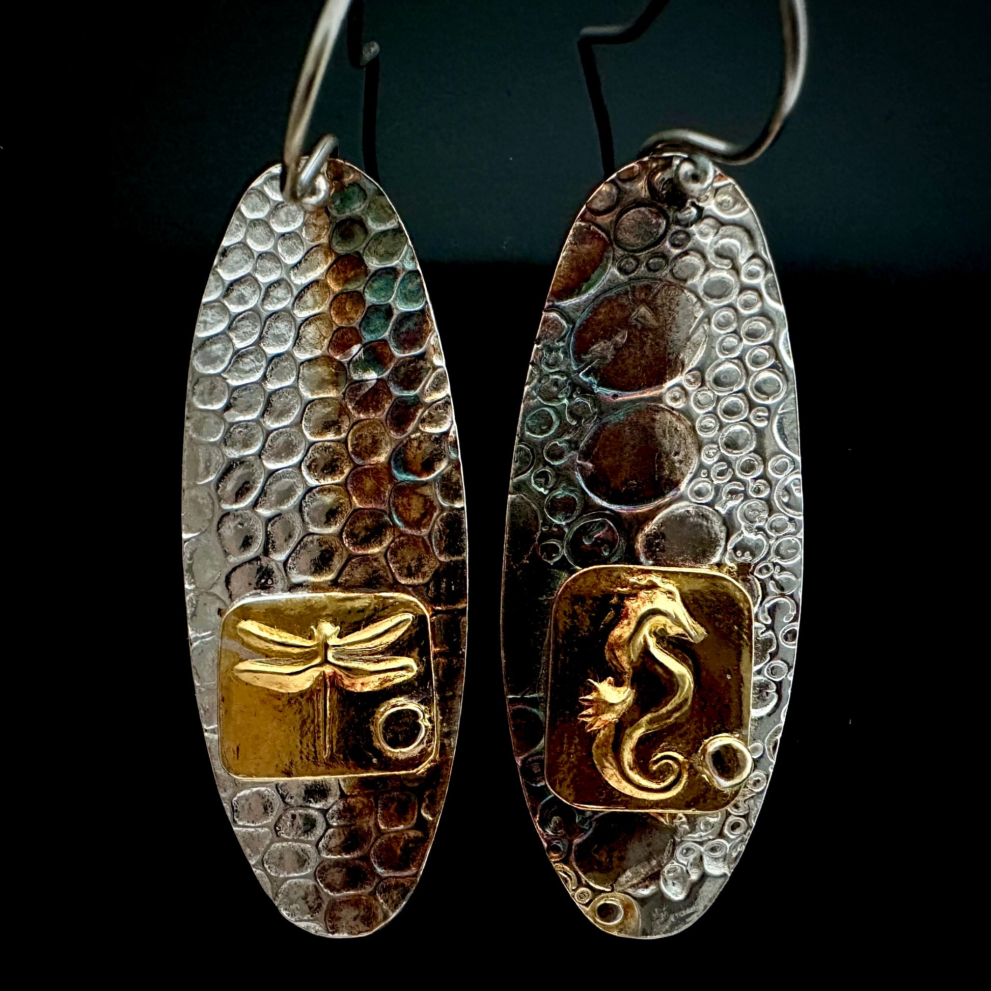 They started out as silver clay using my own earrings as a template. A seahorse stamp was used for one earring and a dragonfly stamp for the other. After drying, refining and smoothing they were kiln fired for 2 hours in a 1650 degree F kiln, What emerged was pure 999 silver. The seahorse and dragonfly were burnished with 24K Gold foil using an ancient Korean technique called Keum Boo. They were painted with patina for accent to make them pop! I love them and am sure others will too.