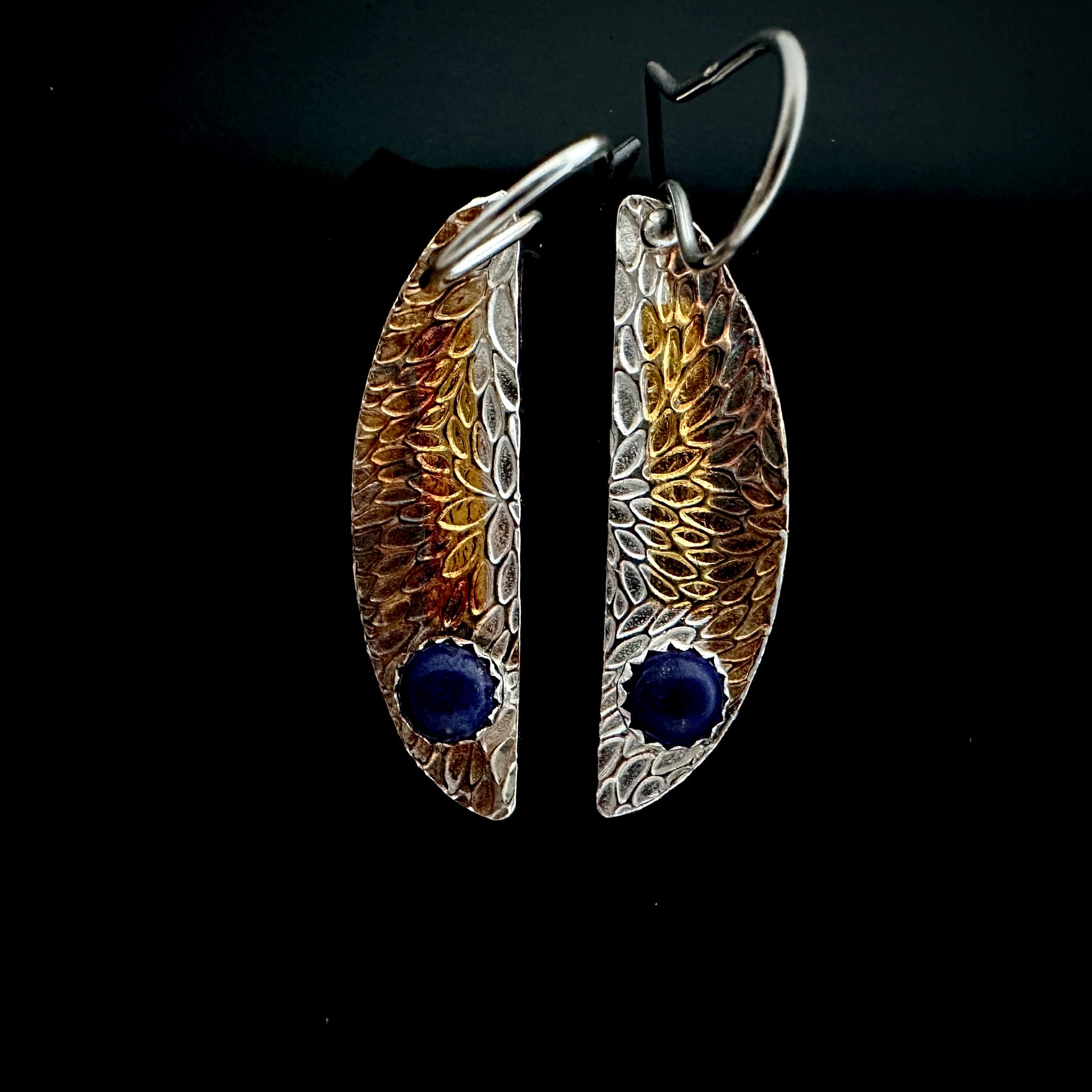 I love these earrings, they are simple but elegant and dressy. The dark blue Lapis shows off the silver and gold. which is such a regal combination.
