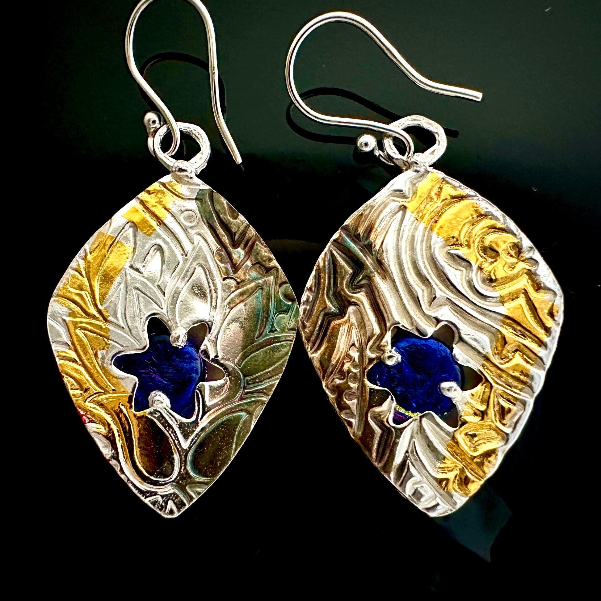 The glass is sandwiched between two layers of silver clay. I decided to have two different textures on each earring to make them unique. The layer at the back is also textured so you can flip the ear wire and have a totally different pair of earrings. There is a window at the back to let the glass breath when it is in the kiln. Since the back is a deep blue and the front is multicolored the contrast is delightful.
