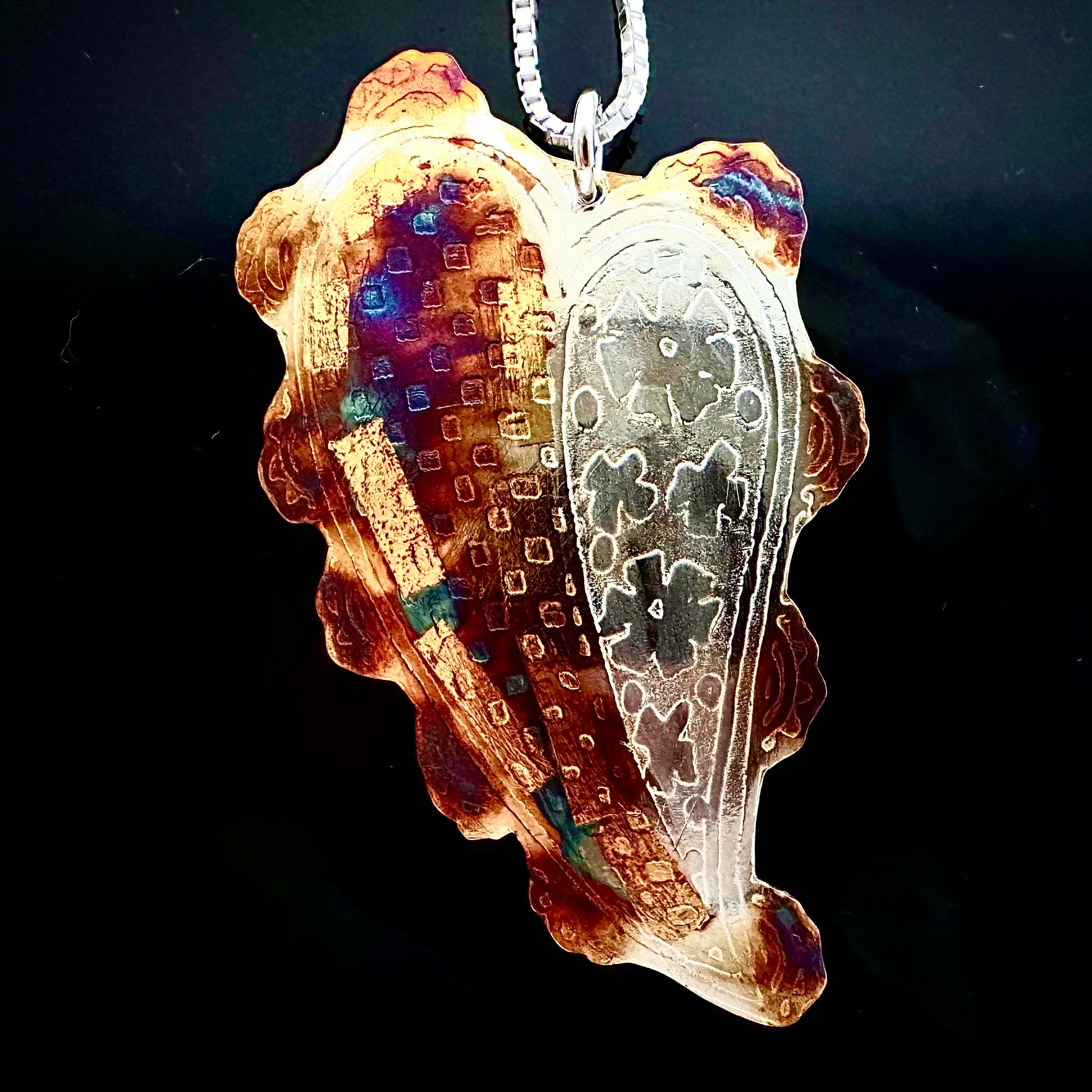 I cut out the pendant from the silver sheet using a jeweler's saw. I filed and smoothed the edges, polished the silver, then depletion gilded it to bring the pure silver up to the surface. I burnished 24K Gold foil onto part of the pendant using an ancient Korean technique called Keum Boo. I painted patina onto parts of the etched surface to accentuate the design.
