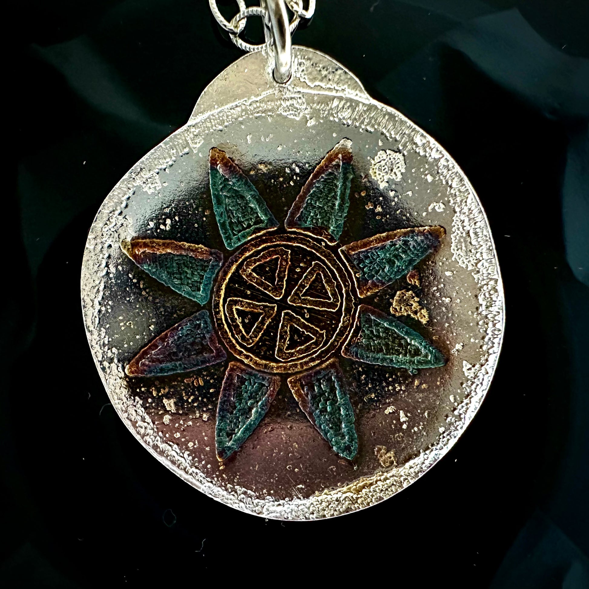 A sun with a geometric design around it as well as a geometric design inside the central ball of the sun. The sun is a symbol of the God Surya worshipped in India. The ancients in India were aware that without the warmth and the bounty provided by the sun we would not exist. This Indian design was etched onto Sterling Silver.