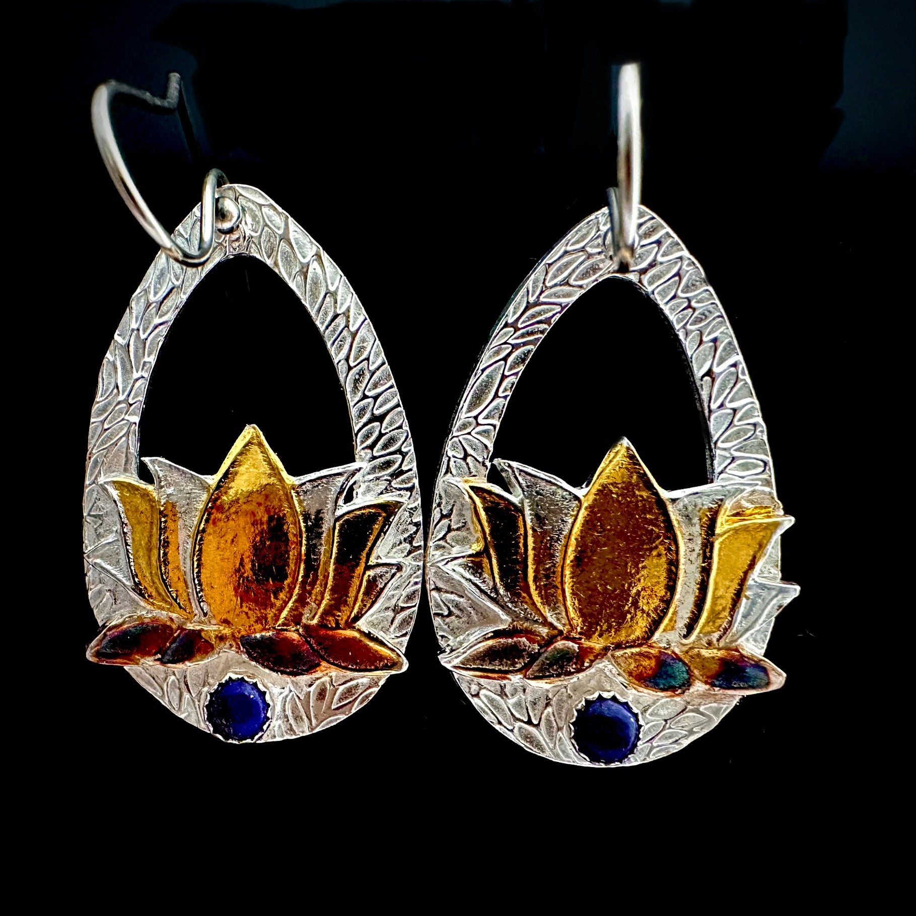 These were made using silver clay made into hoops. The lotus was superimposed onto the hoop. The hoop texture was chrysanthemum petal, a bezel was placed below the lotus. After firing in a 1650 degree F kiln for 2 hours, 24K Gold foil was burnished onto the petals of the lotus. This technique is ancient Korean and called KeumBoo. Patina was painted on the leaves and the Lapis was enclosed in the bezel.