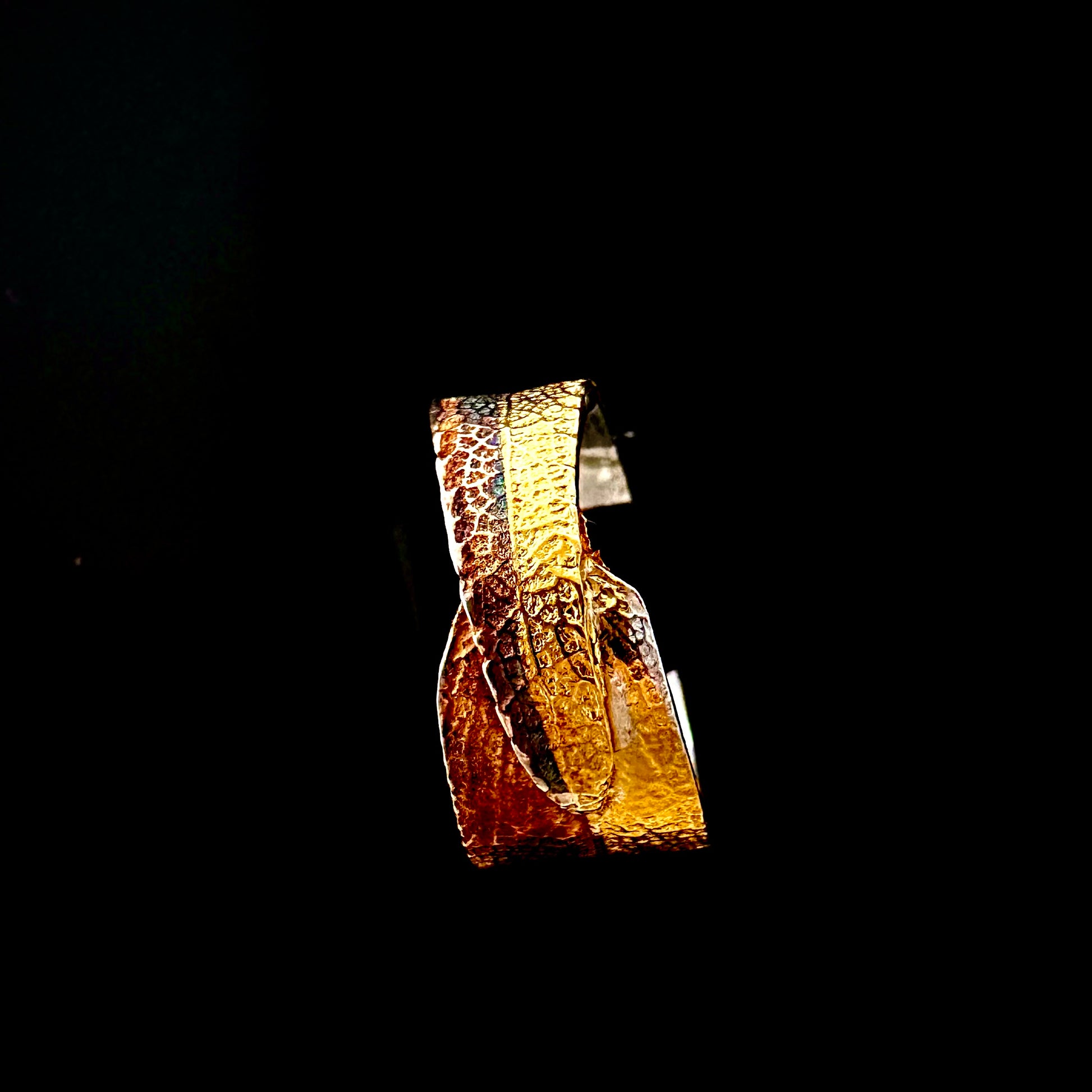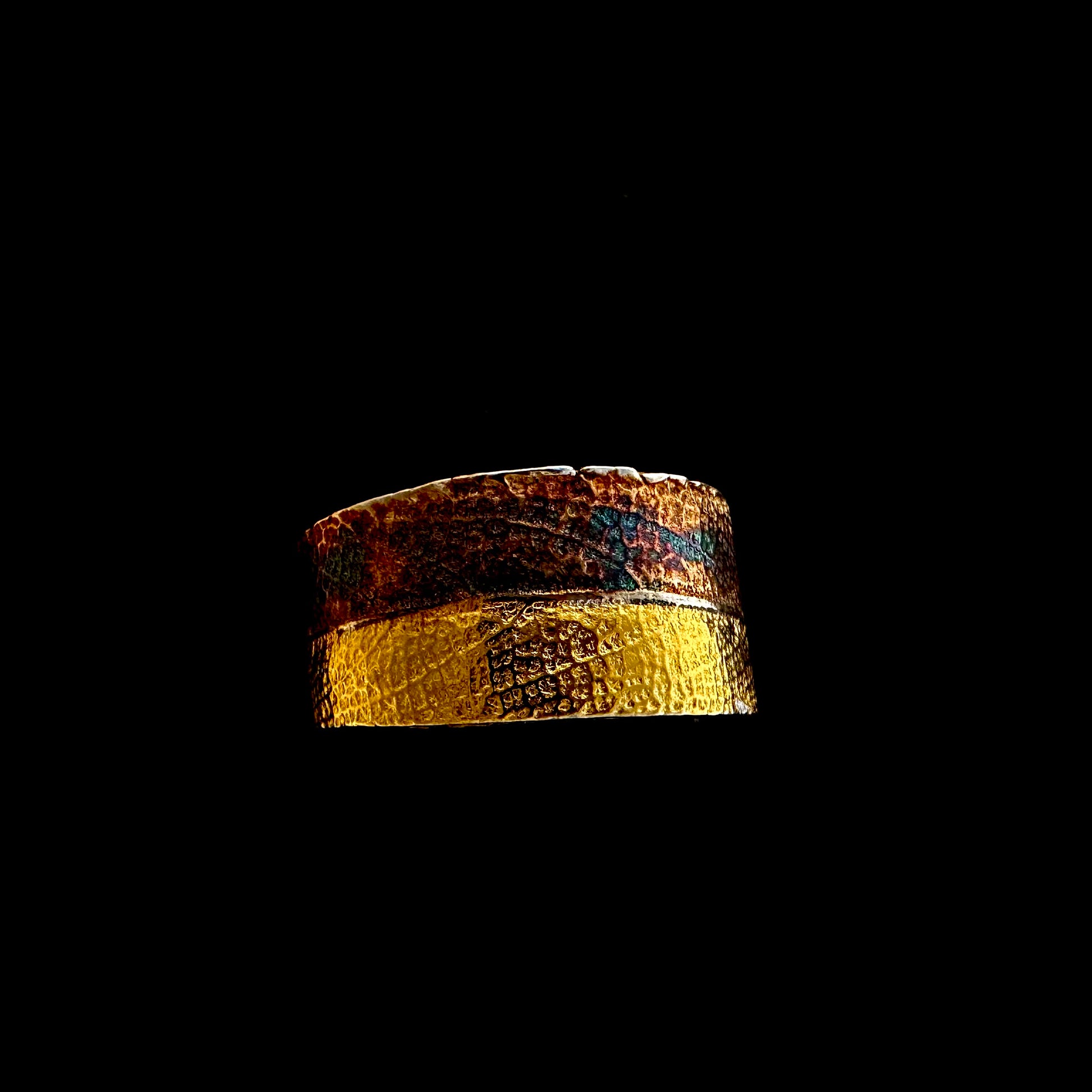 After drying it and refining it it is kiln fired at 1650 degrees for two hours. A beautiful pure silver ring emerges. I burnish half the ring with 24K Gold foil, an ancient Korean technique called Keum boo. I paint the other half of the leaf with patina. The result is stunning. I have sold many of these rings. It is like wearing nature on your finger.