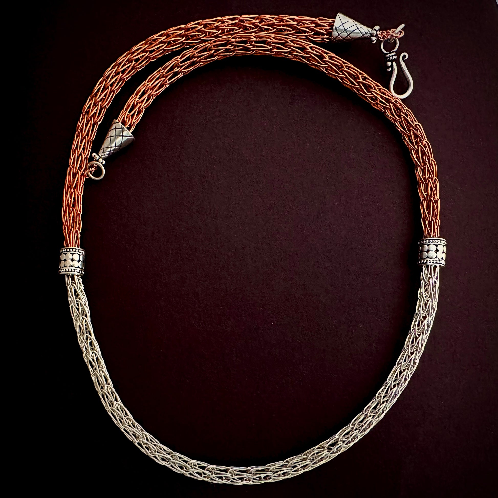In this case I wove sterling silver wire as well as copper wire and then joined a length of knitted copper wire at each end of knitted silver wire. Sterling silver beads joined the silver and copper, while sterling silver cone beads capped the copper wire. A sterling silver clasp completed the necklace.