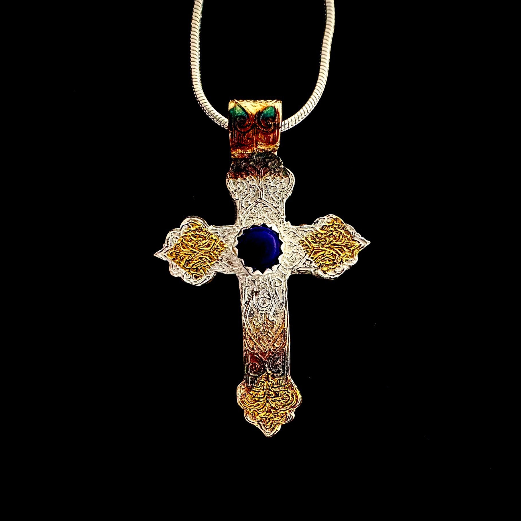 The cross was fired in a 1650F Kiln for 2 hours. What came out was pure silver. This was burnished at the edges with 24K Gold Foil, an ancient Korean technique called Keum Boo. Patina was painted on for accent. The Lapis Lazuli cabochon was tapped into the Bezel which was then secured.
