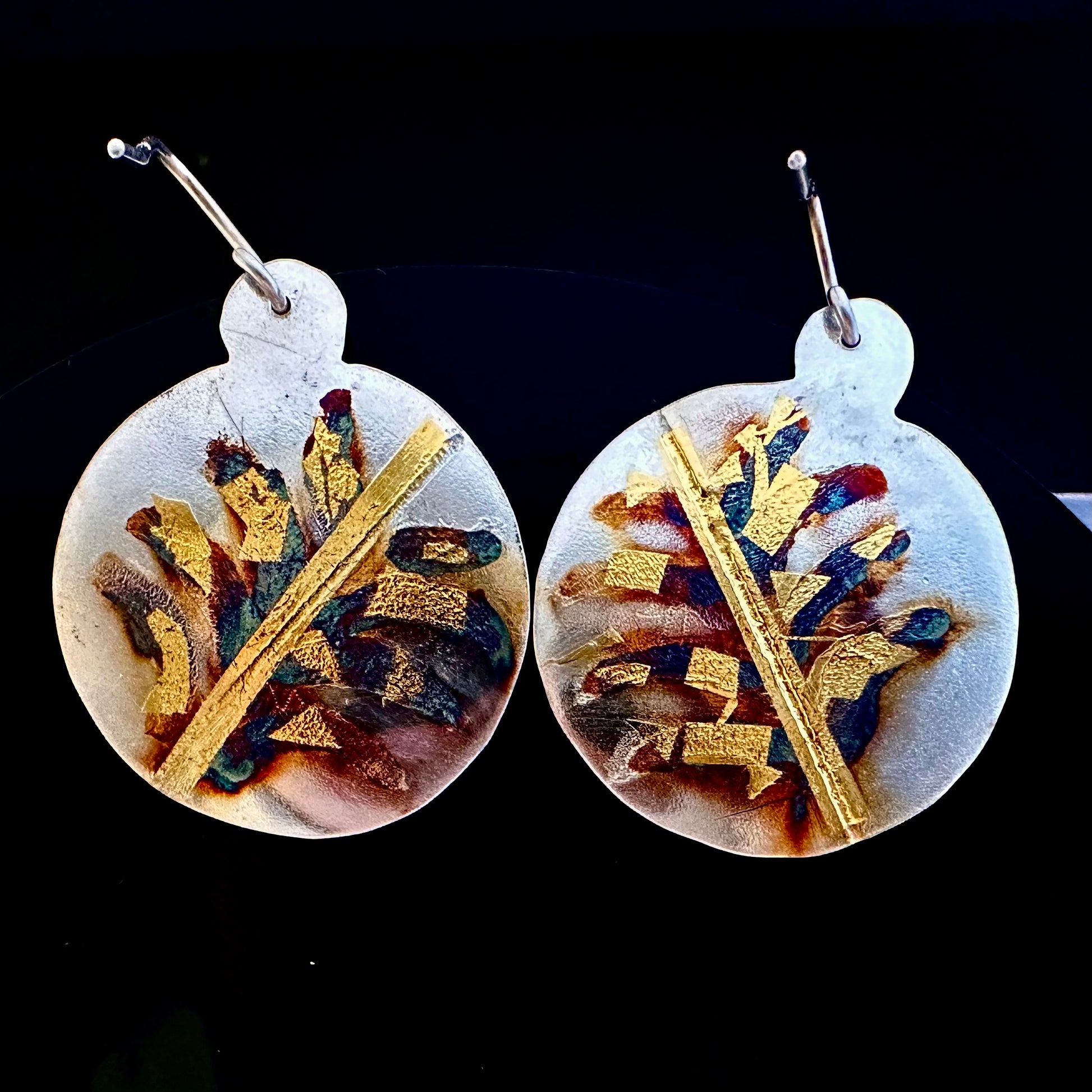 In this case I burnished 24K Gold foil onto the circular part of the Yin and Yang. This process is called Keumboo. I then painted it with patina to get the amazing copper and blue colors which shimmer when the sun shines on the earrings at an angle.